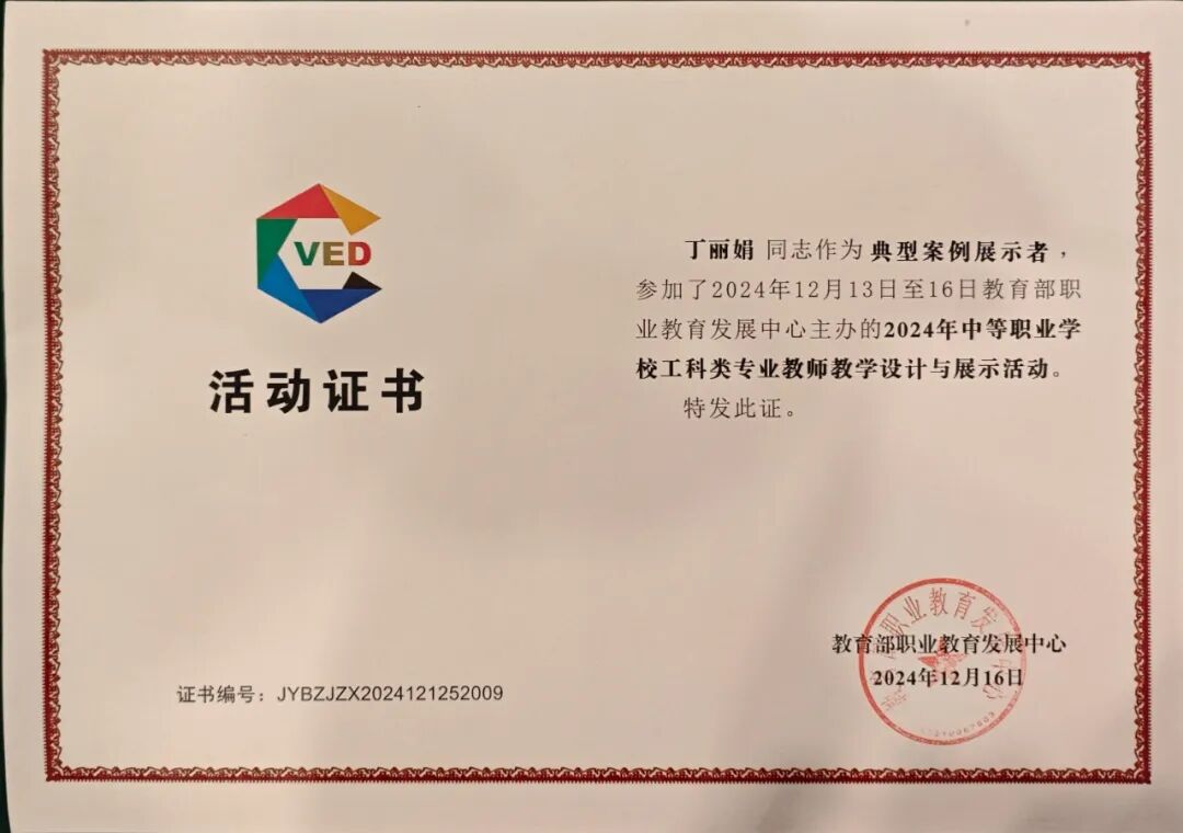 12月13-16日,由教育部職業(yè)教育發(fā)展中心主辦,高等教育出版社承辦,2024年中等職業(yè)學(xué)校工科類教師教學(xué)設(shè)計(jì)與展示活動(dòng)在南寧圓滿落幕。本次活動(dòng)以“提升教師教學(xué)能力,促進(jìn)教師專業(yè)發(fā)展”為核心主題,為全國(guó)中等職業(yè)教育的教師們呈現(xiàn)了一場(chǎng)精彩紛呈的教學(xué)盛宴。來自全國(guó)的參賽教師們從教材內(nèi)容解讀、教學(xué)策略運(yùn)用、教學(xué)過程設(shè)計(jì)、教學(xué)反思提升等多個(gè)維度開展說課展示,并現(xiàn)場(chǎng)呈現(xiàn)教學(xué)設(shè)計(jì)方案、教學(xué)課件及微課視頻等教學(xué)作品。 學(xué)校丁麗娟老師憑借出色的教學(xué)設(shè)計(jì)《驅(qū)動(dòng)電機(jī)性能檢測(cè)》,經(jīng)過專家評(píng)審、現(xiàn)場(chǎng)說課、微課視頻展示與現(xiàn)場(chǎng)答辯等多輪環(huán)節(jié)評(píng)選,在汽車類專業(yè)選手中脫穎而出,被評(píng)為“典型案例展示者”,其參賽作品將被收錄入全國(guó)中等職校工科類教師教學(xué)設(shè)計(jì)典型示范性案例集,由高等教育出版社出版并向全國(guó)推廣。