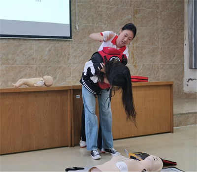 活動初始,紅十字會培訓老師向師生們介紹了紅十字會的起源發(fā)展、工作職責、標志及“人道、博愛、奉獻”的紅十字會精神,使同學們對紅十字會有了初步了解。隨后,紅十字會培訓老師結合理論知識和實際救護技巧對生活中遇到突發(fā)狀況急救、徒手心肺復蘇、溺水緊急救護等內容作了詳細的講解。為了使師生們更加深入的了解各項救護技巧、掌握心肺復蘇要領、培訓老師和師生們在現場展開了深入互動,對心肺復蘇進行了實操演練、手把手向同學們傳授了急救手法和注意事項。