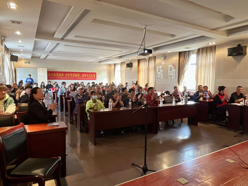 開場歌舞《奢香夫人》、合唱《最炫名族風(fēng)》瞬間帶動全場氛圍;合唱《我和我的祖國》以飽滿的熱情、昂揚(yáng)的精神表達(dá)了對祖國的熱愛之情,展示出新時代青年的責(zé)任與擔(dān)當(dāng);獨唱《今天是你的生日,中國》歌詞中充滿親昵,盡顯愛國之情,爺爺奶奶不禁為此動容……隨著時間的推移,一個又一個精彩的節(jié)目輪番登場,現(xiàn)場掌聲不斷、笑聲連連,氣氛熱火朝天。最后,大家坐在一起陪老人聊聊閑話、說說家常。志愿者們真摯的表情、幽默的話語,逗得老人們樂不可支,現(xiàn)場人員其樂融融地圍坐一堂,充滿了歡聲笑語。