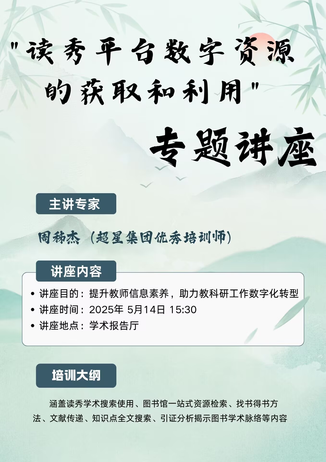 為深化數(shù)字資源服務(wù)效能,提升師生信息素養(yǎng)水平,5月14日下午,學(xué)校圖文信息中心在學(xué)術(shù)報(bào)告廳成功舉辦“讀秀平臺(tái)數(shù)字資源的獲取和利用”專題培訓(xùn)講座。本次講座由圖文信息中心副主任巫海平主持,特邀超星集團(tuán)南京分公司周秭杰講師擔(dān)任主講嘉賓,來(lái)自各院部的專任教師、科研骨干及學(xué)生代表共計(jì)150余人參與學(xué)習(xí)。